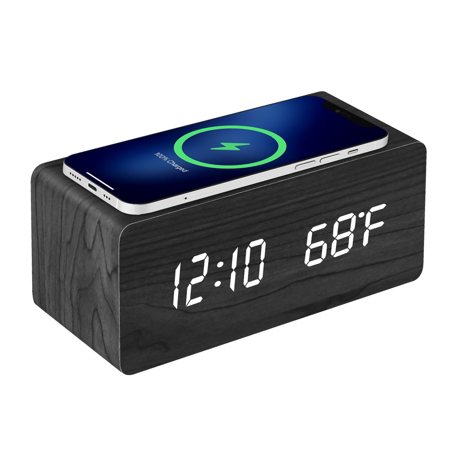 Wooden Alarm Clock With Qi Wireless Charging Pad Compatible With Iphone Samsung Wood Led Digital Clock Sound Control Function Time Date Temperature Display For Bedroom Office Home Black Walmart Com